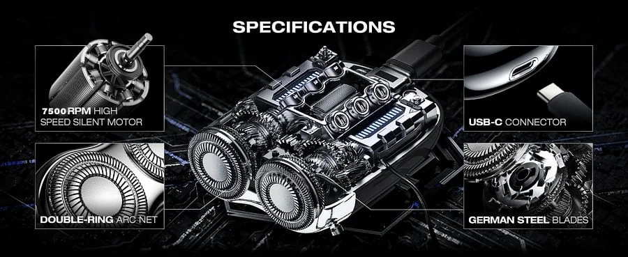 Sharp stainless steel whirl blade, specializing in hard beard, 0.1mm thin stainless steel foil, double ring 3D knife net, increase shaving volume, floating arc surface smooth and remove hair from your skin.